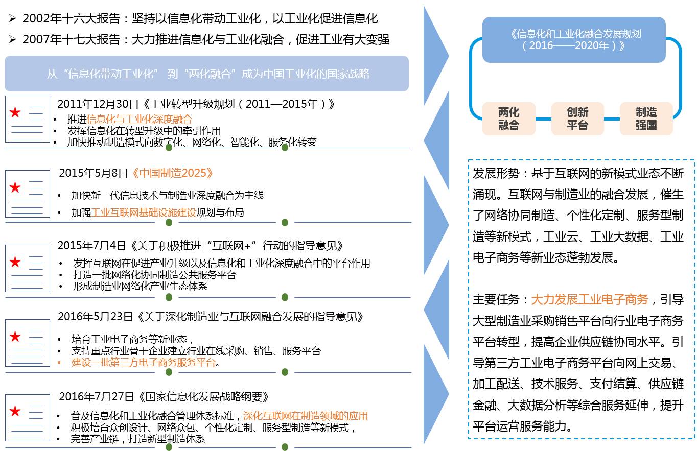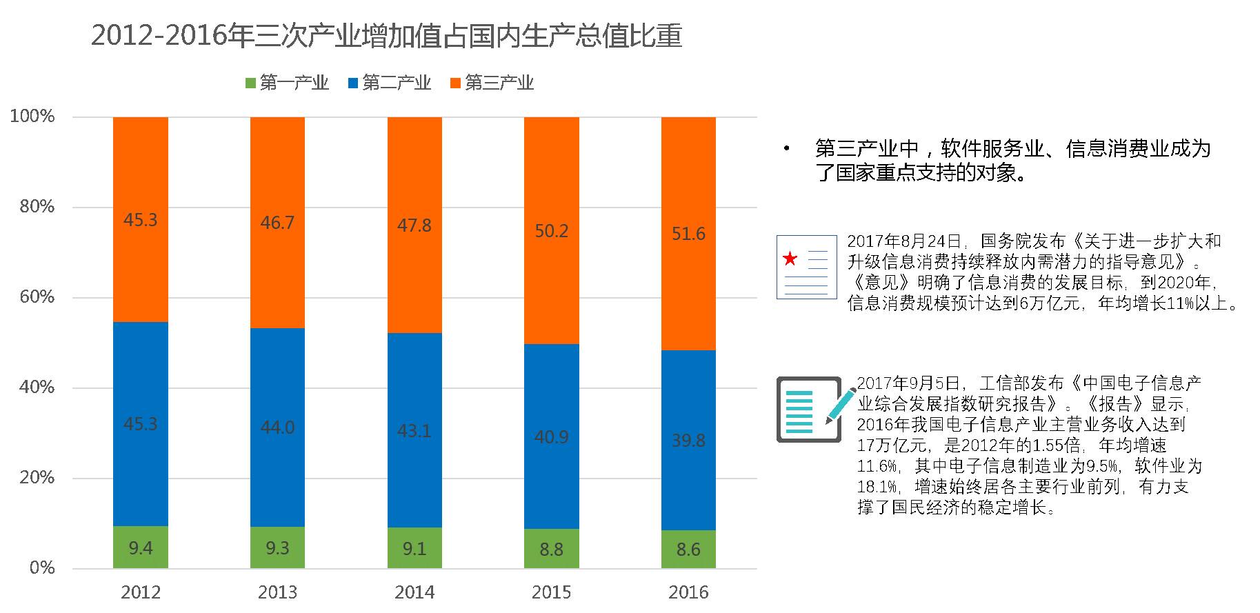 从图上可以看到,在三次产业中,服务业占GDP比重上升到第一,并且在第三产业中,软件服务业、信息服务业成为了国家重点支持对象。这一点在近期国务院印发的文件《关于进一步扩大和升级信息消费持续释放内需潜力的指导意见》和工信部发布的《中国电子信息产业综合发展指数研究报告》都有重要的体现。另外从产业政策上来讲,国家自2002年提出信息化与工业化的关系再到两化融合再到今天大力发展工业电子商务可谓是指出了传统工业转型升级的必由路径。