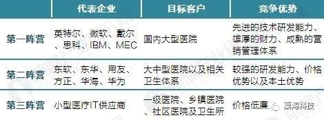 国内市场健康医疗大数据供应商第一阵营有英特尔、微软、戴尔、思科、IBM、MEC等老牌互联网大数据巨头,其主要目标客户为国内大型医院;第二阵营的主要代表有东软、东华、用友、方正等,主要服务对象是大中型医院及相关卫生体系。详见下表。