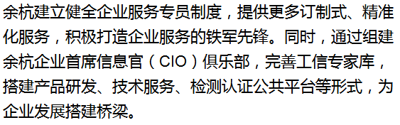 目前,余杭与省工信院等单位合作,积极对接工信部电子工业标准化研究院,争取中国智能制造标准化评估中心落户余杭,努力成为国家标准制定参与单位。