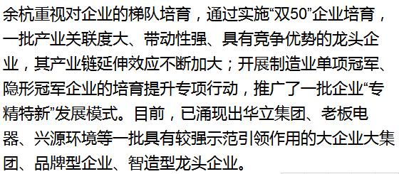 余杭鼓励企业建设企业研发(技术)中心、企业研究院、智能工厂,支持企业转型升级。截至6月底,全区拥有国家重点支持领域高新技术企业432家、国家级企业技术中心5家、省级重点企业研究院17家、省级企业技术中心29家、省级企业研发中心104家、最新评选中的杭州市十大智能工厂中余杭区独占四席。