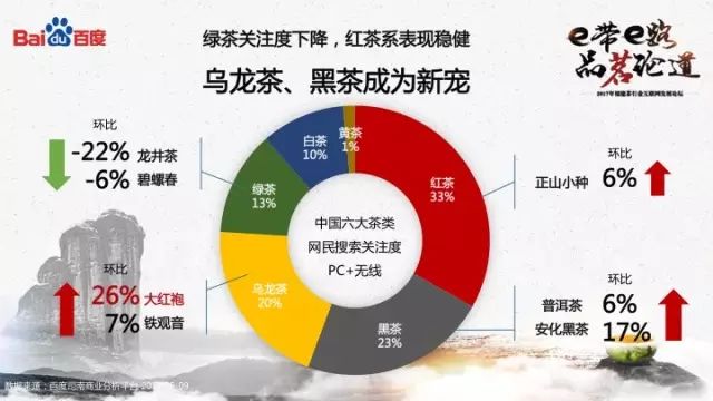 从搜索内容上看,中国六大茶类中,红茶关注度最高,占33%;乌龙茶和黑茶关注度增长强劲,而绿茶的热度则有所下降。其中,安化黑茶关注度环比增长17%,大红袍关注度增长更是高达26%。大红袍在金砖五国会议上曾作为国礼赠送外宾、张艺谋导演的《印象大红袍》山水实景演出也提高了其知名度,可见,媒体与市场的声音都会影响网民的关注。