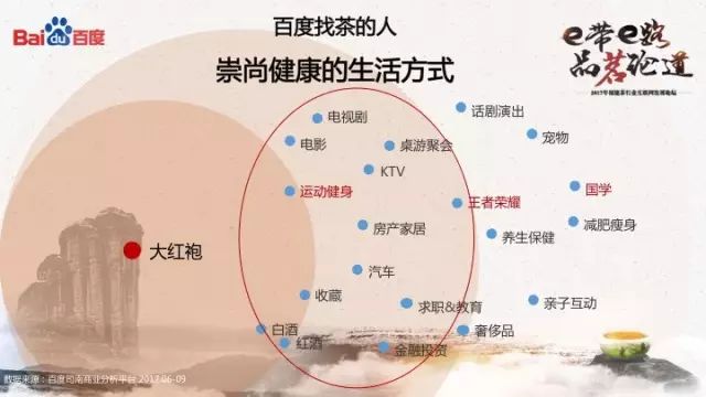 百度大数据这样描述“找茶”之人:职场的中坚力量,热爱运动,崇尚健康的生活方式,平时关注房产和汽车,闲了和好友们打打王者荣耀,邀三五好友喝点小酒品品茶。