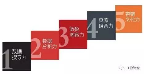 数据分析力。在面临规模性 (Volume)、多样性 (Variety)、快速性 (Velocity) 等方面均有着显著不同的大数据时,只是增加几台服务器显然解决不了问题。从数据管理、数据挖掘、可视化分析到预测性分析,一整套数据分析能力需要传统企业迅速建立。重新配置资源成立一个与各个部门间紧密合作的独立部门必不可少,抑或像本文开头大学生创业的故事中,专门成立一个子公司来独立运作相关活动是一个更为明智的选择。例如,阿里巴巴上市后已成为仅次于谷歌的全球第二大互联网公司,2008年就把大数据作为一项公司基本战略,而后把阿里云和阿里数据平台成立单独的事业部,为阿里巴巴集团内部和外部客户服务。