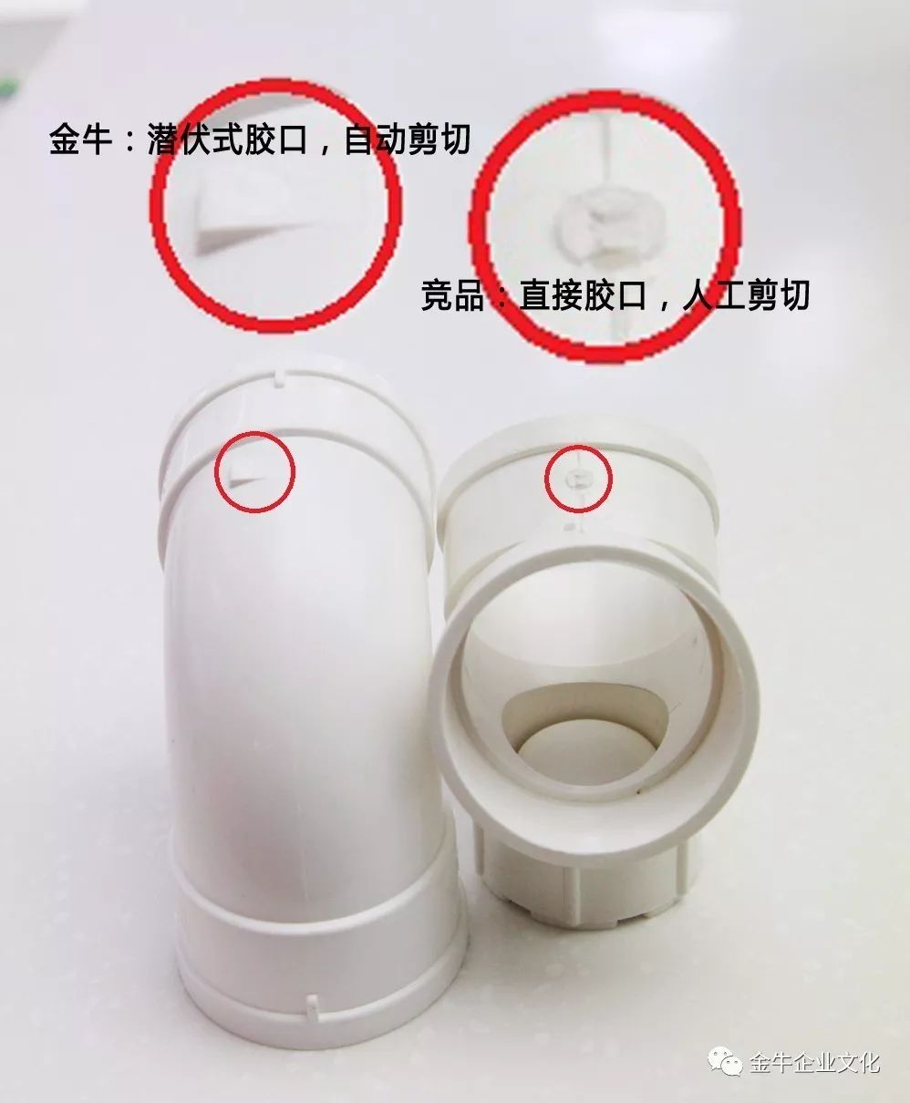 PVC产品,在行业内看来,它只是低端的排水用产品,不注重产品的美观,但在金牛的PVC产品上,可以感受到金牛人精益求精的理念。金牛的PVC管件设计立足于中高端市场,讲究产品外观与性能的一致性、独特性,我们使用了潜伏式胶口模具,使产品在脱模时就能与胶口分离,无需人工剪胶口,也进一步提高了产品的分拣与装箱效率。