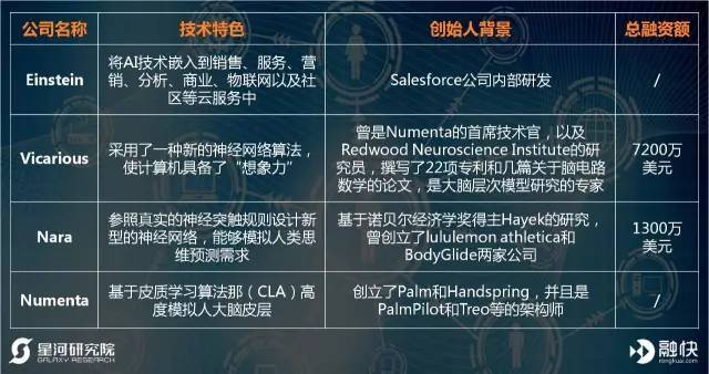 除了依靠海量数据和神经网络等技术所开发的人工智能技术外,目前市场中也存在着一些非常前沿的技术路线,例如结合了神经学和脑科学的强人工智能研发企业Vicarious、基于拓扑结构和脑科学的Nara以及基于大脑皮层活动开发皮质学习算法的Numenta等,目前也都取得了一定的成绩。