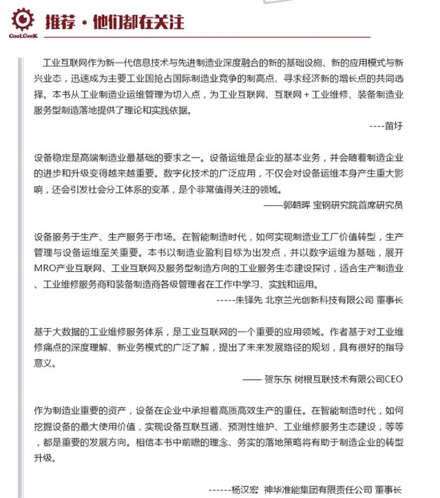 本书获得了宝钢研究员首席研究员 郭朝晖、北京兰光创新科技有限公司董事长 朱铎先、树根互联技术有限公司CEO 贺东东、神华淮能及软有限责任公司董事长 杨汉宏等的推荐。并在理论上,获得了著名设备管理专家-张孝桐老先生的特别支持。