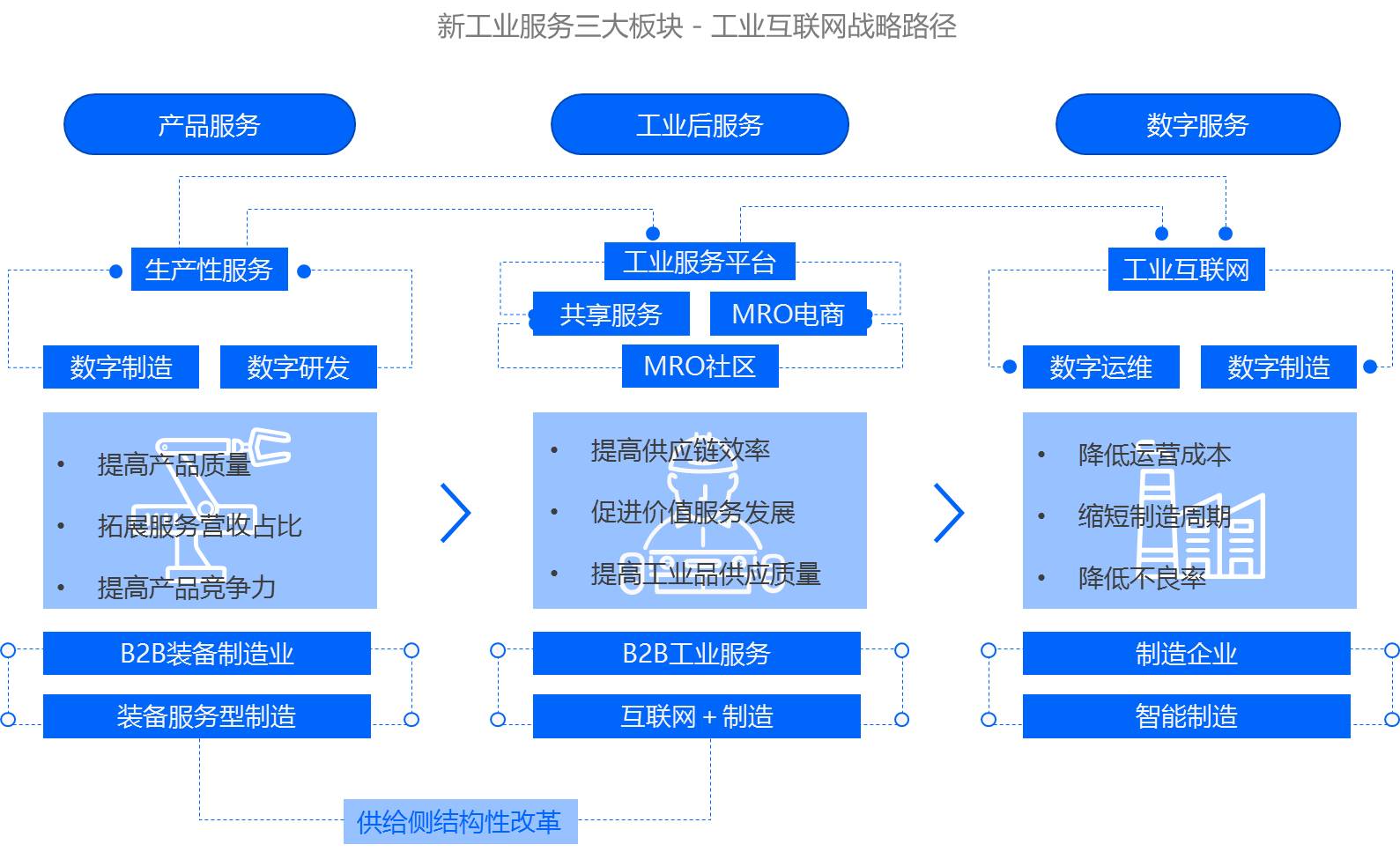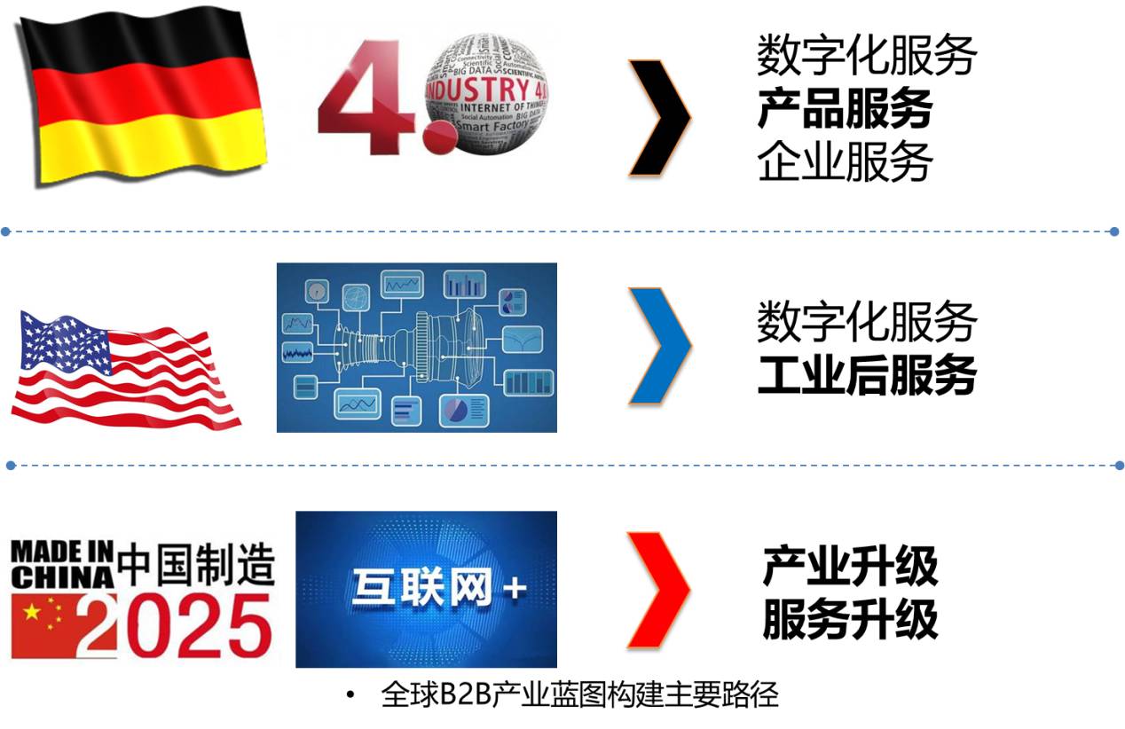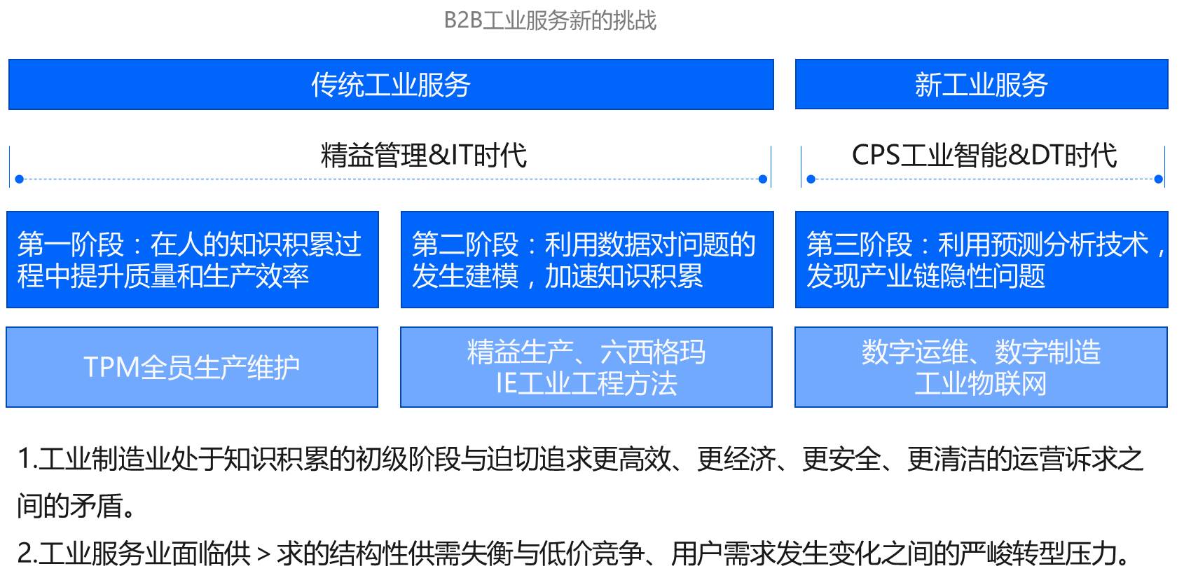 通过B2B工业服务新模式、新理念和新技术的融合,实现B2B产业转型“新蓝图构建,完整体现了工业互联网生态的三个基本组成部分“数字服务”、“产品服务”“工业后服务”。符合供给侧结构性改革的基本要求,是装备服务型制造\互联网+制造\智能制造的最佳切入路径。