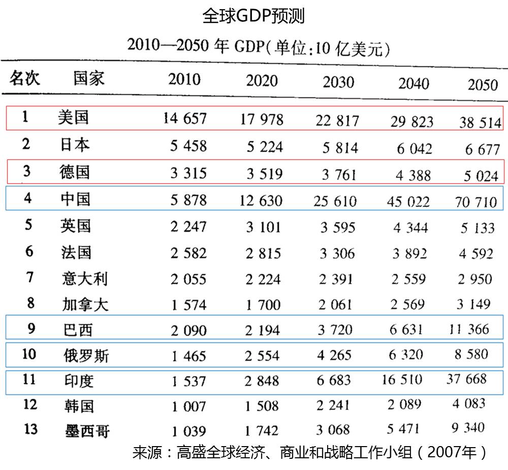 经济上,金砖四国(巴西、俄罗斯、印度和中国)生活着世界上40%以上的人口,中国是它重要的组成部分。未来20年之内,金砖四国的GDP将超过传统G8国家GDP之和。