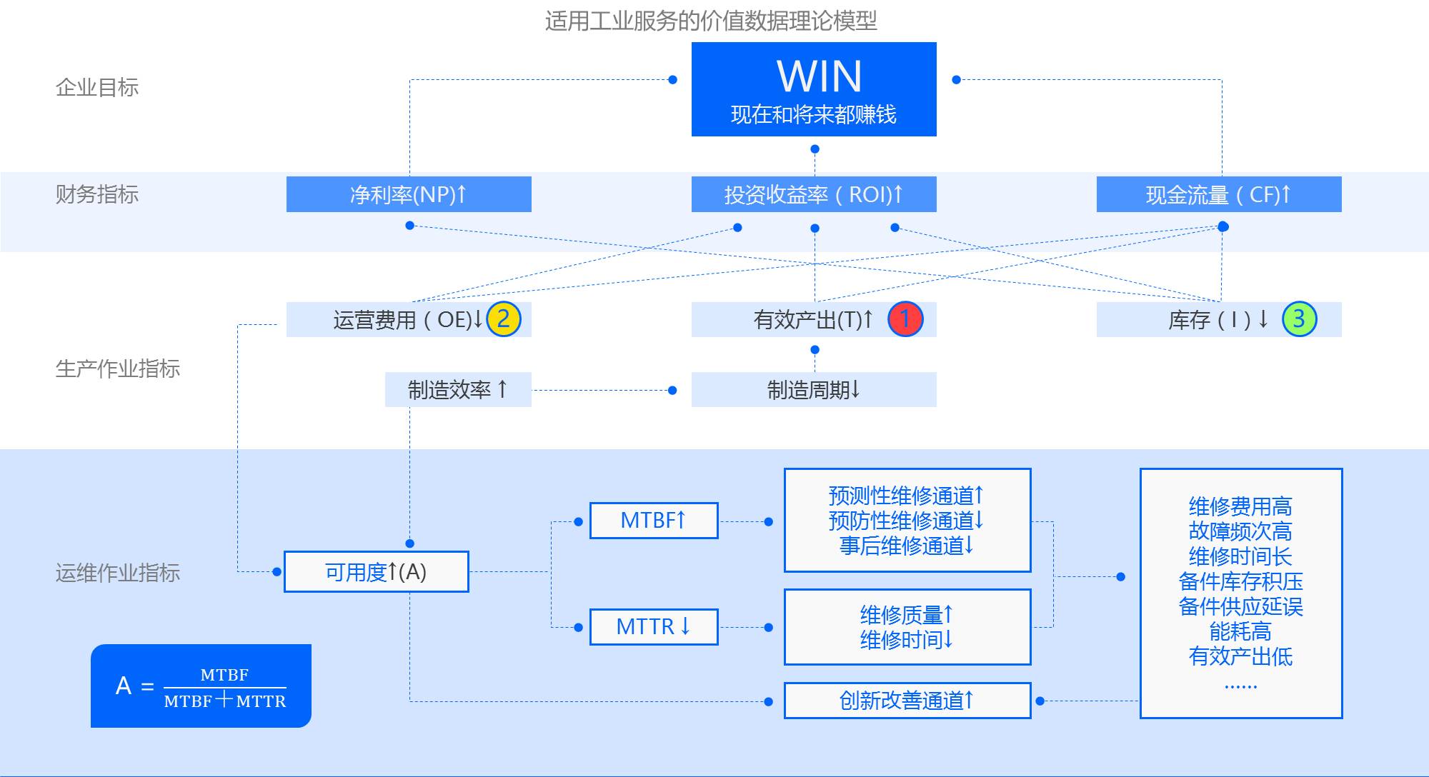 可用度是衡量运维能力的重要指标,这依赖于四大通道的建设和优化(预测性维修通道↑,创新改善通道↑,而被动的事后维修通道↓,优化保留必要的预防性维修通道↓),这不仅有效保障有效产出,还能有效的降低运维费用,降低备件呆滞库存。