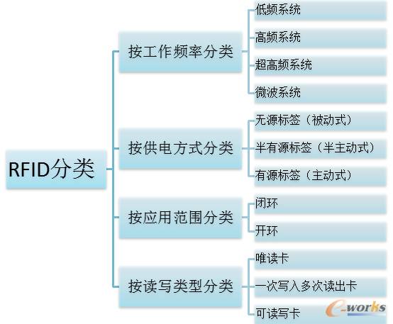 RFID的分类有多种方式,可分为按工作频率分类,按供电方式分类,按应用范围分类,按数据读写类型分类。