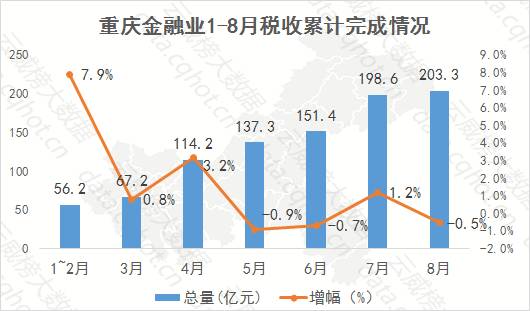 截至8月,重庆金融业税收累计完成203.3亿元,增幅下滑0.5%。从整体增长情况来看,自年初以来,税收增幅上下波动。