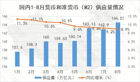 1-8月,国内货币和准货币(M2)供应量累计达164.51万亿元,与去年同期相比,供应量增长均超过8%。其中,从增长幅度来看,自年初以来呈缓慢下滑趋势。