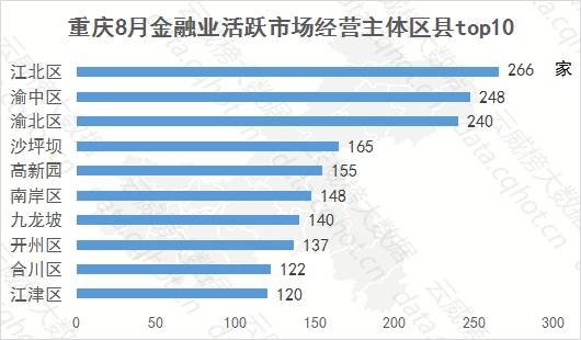 8月,重庆金融业活跃市场经营主体4732家,环比有小幅度增长。其中,江北区以266家居排行榜首位。