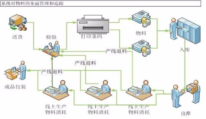 MES与ERP系统,在仓储管理上面存在着管理等级上的差别,一般来说,ERP系统能够管理到仓库当中各种类型物料的总量,以及所有物料的进出情况,但是,ERP系统没能管理到物料在仓库当中如何具体存放,也没能对物料的进出规则进行有效的管理,比如:先进先出的管理,零散物料先出的管理,等等。MES系统恰恰弥补了ERP系统在这方面的不足,从物料进厂检验开始,追踪其入库,出库,产线使用消耗,产线剩余返仓,产线发现质量问题返回供应商等等一系列的行为和操作,为物料建立完备的历史信息档案,并提供相应的查询和管理方法,满足用户在统计和物料追溯方面的各项需求。下图示意了物料在MES系统当中的整个追踪过程: