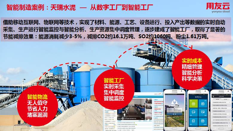 用友公司已经服务了一大批制造企业走向智能制造。诸如助力天瑞集团实现智能工厂到智慧管控、航天八院构建智慧八院、旭阳集团实现敏捷面向客户并拉升资源效率。