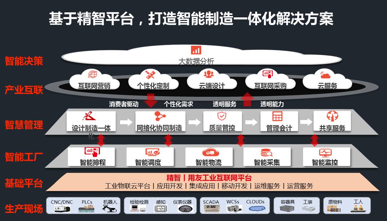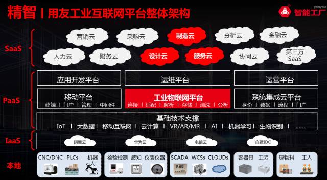 用友精智是面向工业企业的社会化云平台,是工业视角的用友云。从整体架构来看,用友精智主要包含PaaS和SaaS两大部分,其由基础技术支撑平台、工业物联网云平台、应用开发平台、运维平台、运营平台、移动平台、系统集成云平台等构成,融合了大数据、云计算、移动互联网、物联网、人工智能、机器学习、视觉分析、生物识别等现代信息网络技术,其核心是为工业企业提供设计云、制造云、服务云、分析云、营销云、采购云、财务云、人力云、协同云以及第三方SaaS服务,以及开放的生态体系,帮助工业企业实现敏经营、轻管理、易金融、简IT。