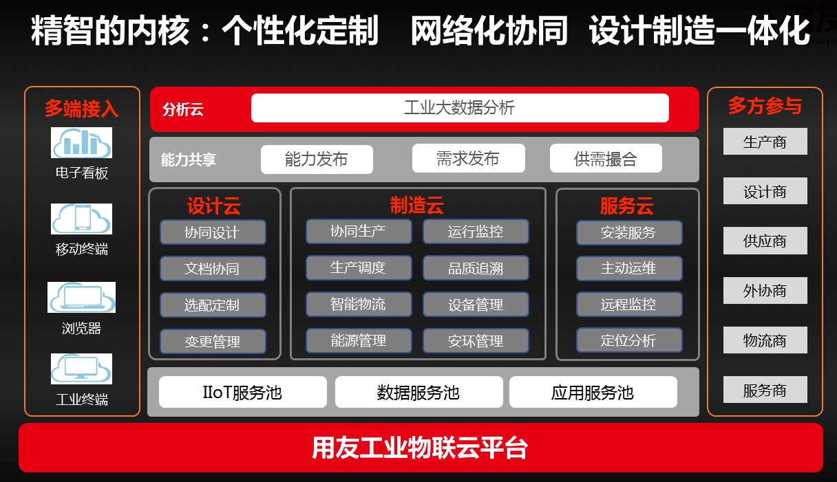 用友精智有三大内核,即个性化定制、网络化协同和设计制造一体化。基于用友工业物联云平台,用友精智的核心工业应用包含设计云、制造云和服务云,同时多端接入、多方参与,实现工业企业包括能力与供需撮合的能力共享和应用共享。