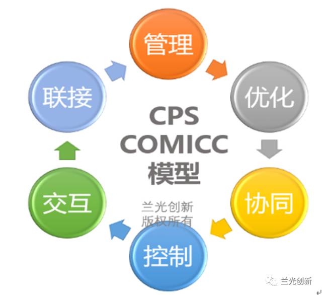 我们通过进一步研究可以发现,在CPS视角中,兰光智能MES中的6个动词分别是联接、管理、控制、协同、优化、交互,如果用英文表达,可分别使用Connect(联接,包含通讯、采集等技术内容,也包含物与物的联接,如物联网,人与人的联接,互联网等,都属于联接范畴),Manage(管理),Optimize(优化),Collaborate(协同),Control(控制),Interact(交互),首字母可组合为COMICC,笔者称之为CPS COMICC模型。CPS传统的3C模型(Communication(通讯)、Computing(计算)、Control(控制))总体上停留在技术层面,没有体现联接、管理、优化、人机友好等层面的含义,相对3C模型,笔者认为COMICC模型内容更丰富,应用场景更清晰,对制造业有更强的落地指导性。