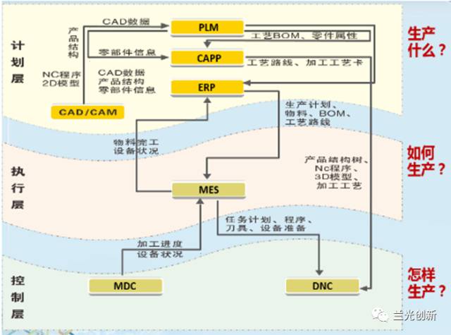 产品在PLM中使用CAD进行三维设计,在ERP做出主生产计划,计划被MES接收后,经APS(高级排产系统)自动生成最优的作业计划,可以具体到每一工序、每一设备、每一分钟,机床需要的加工程序直接通过DNC系统传输到机床里,通过MDC系统实时采集机床状态、加工进度,基于这些数据基础上形成智能化的决策分析与可视化展现,并通过MES系统反馈到ERP系统,实现企业闭环的管理。