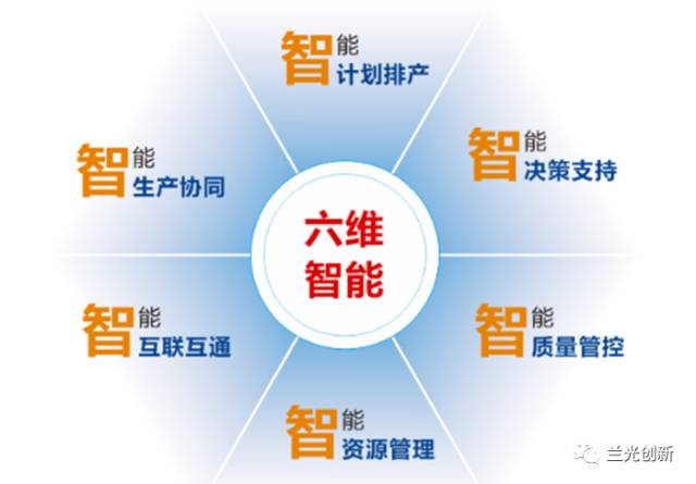 在领先的数字化车间解决方案的基础上,结合工业4.0等先进理念,兰光创新在国内首次提出了“六维智能理论”,即从6个维度的“智能”打造中国特色的智能MES系统:智能计划排产、智能生产过程协同、智能设备互联互通、智能生产资源管控、智能质量过程控制、智能大数据分析与决策支持。分别从计划源头、过程协同、设备底层、资源优化、质量控制、决策支持等6个方面着手,实现全面的精细化、精准化、自动化、信息化、网络化的智能化管理与控制,从而实现“物理实体与赛博虚体虚实深度融合”的系统级CPS系统。