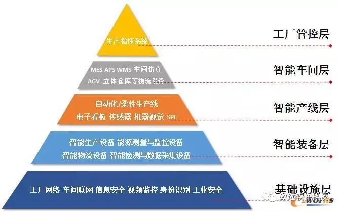 智能工厂可以分为基础设施层、智能装备层、智能产线层、智能车间层和工厂管控层五个层级(图3):