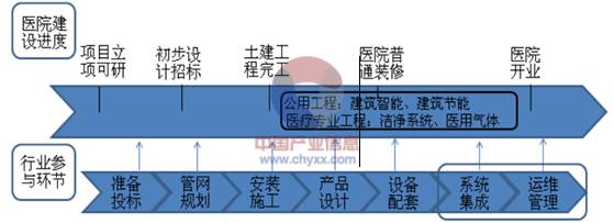医院建设包括从医院建设咨询与设计、融资、医院修建、装饰工程、医疗专业工程、医疗设备与器械配置、智能化与信息化、运行维护等环节。从功能属性看,医院建筑具有医疗和建筑的双重属性:1)从公共建筑属性看,医院建设包括土建施工、机电设备、智能节能和普通装修四个环节;2)从医疗属性看,医院建设重点突出医疗专业工程建设,包括洁净手术部工程、医用气体工程、ICU 整体配套工程、消毒供应中心等十多个子行业,其中洁净净化系统和医用气体工程是最主要的两个部分。