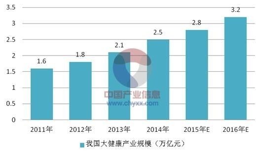中国产业信息网发布的《2015-2020年中国大健康产业市场分析及发展趋势研究报告》中指出:“健康中国2020”战略明确提出到2020年我国主要健康指标基本达到中等发展中国家的水平,人均预期寿命将从2005年的73岁增加到2020年的77岁,卫生总费用占GDP的比重要增加到6.5-7%,提高两个百分点。国务院于2013年9月发布了《关于促进健康服务业发展的若干意见》,提出到2020年,基本建立覆盖全生命周期的健康服务业体系,健康服务业总规模达到8万亿元以上。