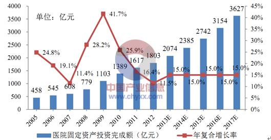 从 2005 年的 458亿元增长到 2012年的 1803亿元,年复合增长率为 21.6%,其中 2010-2012 年增速放缓,年复合增长率为 13.9%,在 PPP 模式推动下,预计县级医院的建设将会继续增加,医院固定资产投资会持续高增长,综合估计 2013-2017年的增长率为 15%,则 2017年医院固定资产投资完成额将达到 3627 亿元。