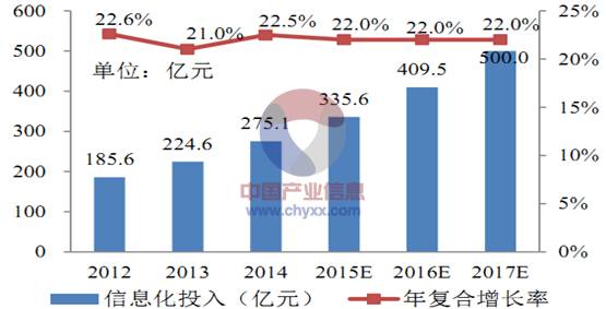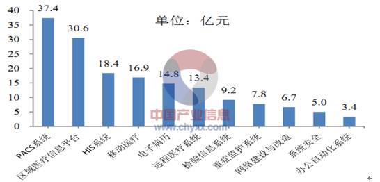 预计到 2017年医疗信息化投入将到达 500亿元。 2012 年医疗卫生行业的信息化投入规模为 185.6 亿元,2014年达到了 275.1 亿元人民币,年复合增长率为 22.0%,假设未来三年以该速率持续增长,则 2017 年将达到 500 亿元左右。2014 年医卫行业信息化建设中,PACS系统、区域医疗信息平台、HIS 系统、移动医疗和电子病历的投入比较大,占到了总投资的70%以上。2014 年国家大力推广电子病历系统的建设,这无疑促进了医院电子病历建设的进程。大中型医院的信息化建设中心已逐步转至以病人和临床为中心的数字化医院建设,将对PACS 系统和电子病历系统、移动医疗的搭建和应用进行重点投资。