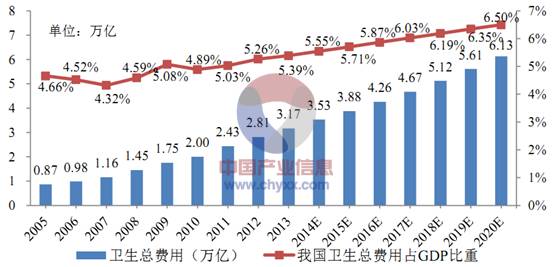 从总量来看,中国医药卫生费用在 2013 年已达到 3.17万亿,占 GDP 百分比为 5.4%, 05-13年复合增长率为 17.54%,高于 15.5%的 GDP 复合增速。2012 年 3 月 14 日,国务院 “健康中国 2020”战略明确提出到 2020 年我国卫生总费用占 GDP 的比重要增加到 6.5-7%。假设2014-2020年我国 GDP复合增速为 6.8%, 2020年医药卫生费用占 GDP比重为 6.5%,则 2020年医药卫生费用将达到 6.13万亿。