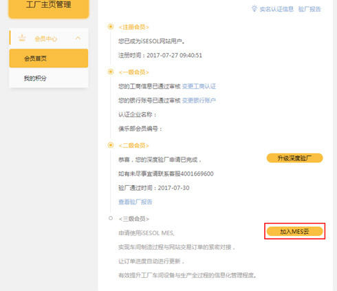 供方企业通过深度验厂成为二级会员后,在会员中心可以看到“iSESOL MES”系统接入的按钮,提交申请后iSESOL网会主动联系供方企业。