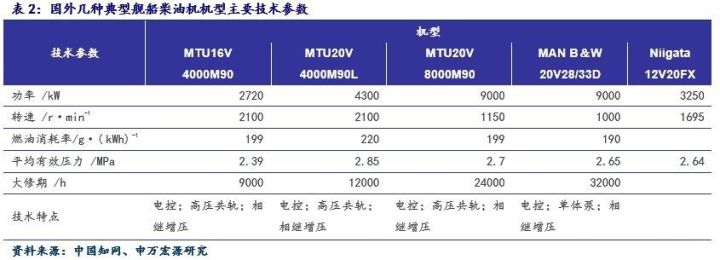 柴油机由于功率覆盖范围广,油耗低等特点,在中小型舰船中应用较广。柴油机在工作过程中吸入纯空气与柴油混合,并点火燃烧形成高温高压燃气,燃气推动活塞向下运动使曲轴旋转而作功并带动螺旋桨推动船舶。自20世纪80年代以来,世界柴油机技术飞速发展,现代柴油机已达到很高的技术水平,舰船用柴油机具有热效率高、全工况范围内油耗低、功率和转速范围广、有较低的功率体积比和功率质量比、空气耗量少、排温较低等优点,在中小型舰船动力装置中占主导地位。目前世界舰船柴油机主要以大功率高速柴油机为主,随着舰船向大型化发展,越来越多的大功率中速柴油机被选作舰船主机。国外生产舰船柴油机的公司主要有MTU、SEMT、MAN、瓦锡兰、卡特彼勒、道依茨(Deutz)和新泻动力(Niigata)等。