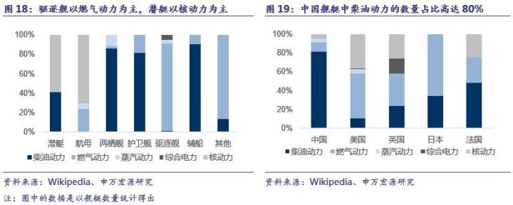 2. 核动力、燃气轮机应用比例较低,国内舰船动力系统与国外仍存较大差距