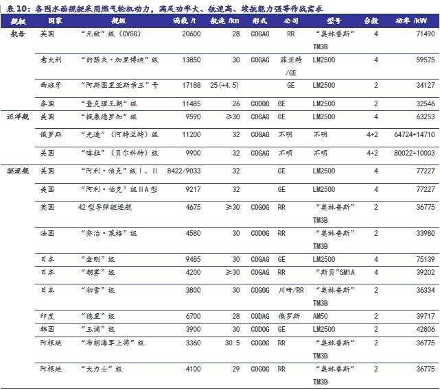 我国海军舰艇使用的动力系统与国外海军仍存在较大差距。1)现役的潜艇中,美国、英国、法国等潜艇均已全面应用核动力,而我国仍有大量常规动力潜艇服役;2)水面舰艇中,美国、日本等大中型舰艇基本采用燃气轮机动力,实现“全燃动力化”,舰艇航速高、功率大,而我国仅少量水面舰艇采用燃气轮机动力,大部分水面舰艇仍为柴油机动力和蒸汽动力,差距明显;3)美国、英国等先进水面舰艇率先使用了综合电力系统,我国综合电力系统研发取得突破,未来有广泛的应用空间。