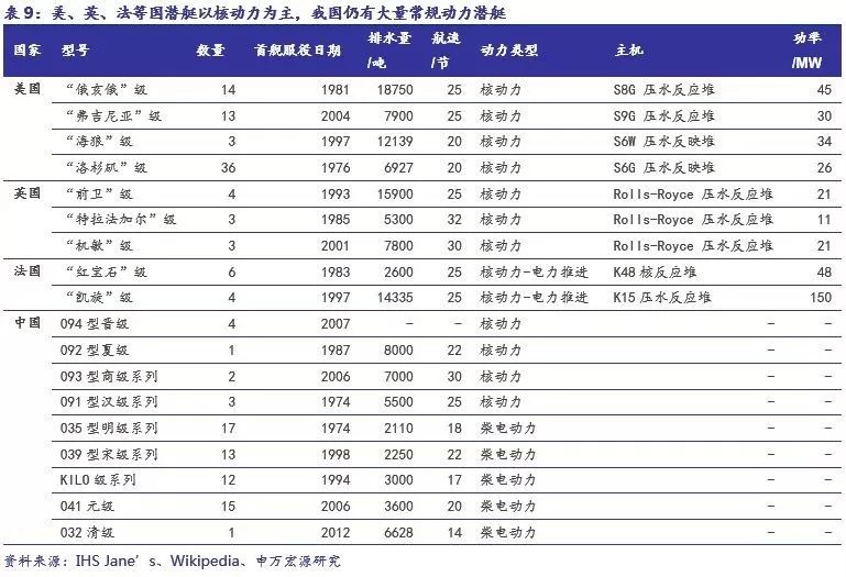 潜艇分为战略核潜艇、攻击核潜艇以及常规动力潜艇等。美国、英国、法国等国家的潜艇均为核动力潜艇,普遍采用压水反应堆作为主机。美国“俄亥俄”核潜艇自1981年服役至今,数量超过14艘;“洛杉矶”级自1976年服役至今仍有36艘在役。中国的常规动力潜艇仍有58艘,包括“明”级、“宋”级、“元”级、“清”级、基洛(KILO)级等,均为柴电动力推进,与国外普遍采用核动力装置存在较大差距。