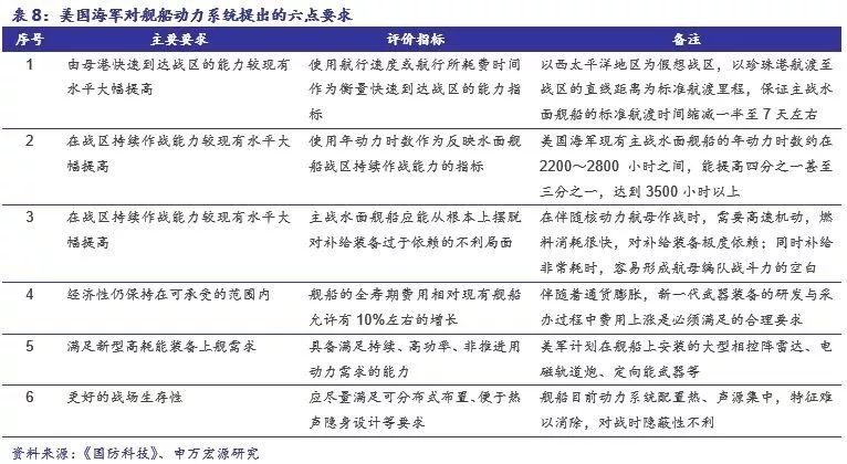 美军对未来舰船动力系统提出更高要求,舰船速度和持续作战能力受到关注。根据2007年3月由美国海军海上系统司令部(NSSC)出版的《水面和两栖作战舰船可替代动力方案》的研究成果,美国官方对于未来舰船动力方案提出了六点要求,对舰船动力系统的持续性、安全性、生存性以及经济性等提出了更高要求,且舰船的速度和持续作战能力受到格外关注。
