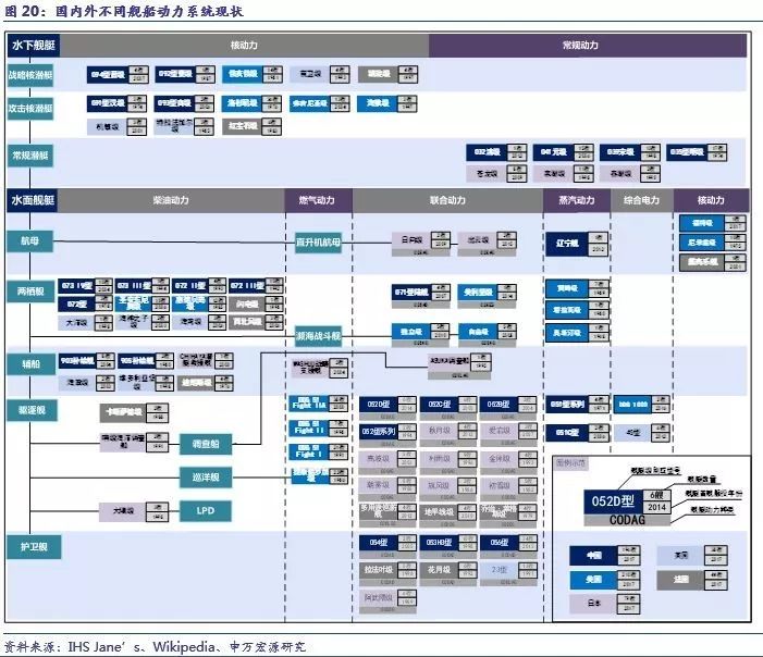 第二,从各国使用总览来看,以舰艇数量统计,一国海军舰艇通常具有一至两种主导的动力系统型式。这也是由该国的动力技术状态和使用经验决定的。例如中国当前主导的动力型式为柴油动力,比例接近80%,美国则为核动力及燃气动力,日本为燃气动力和柴油动力等。
