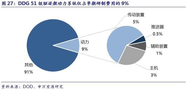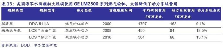 3.2.1规模化使用燃气轮机动力,万吨级驱逐舰动力系统费用占比仅9%