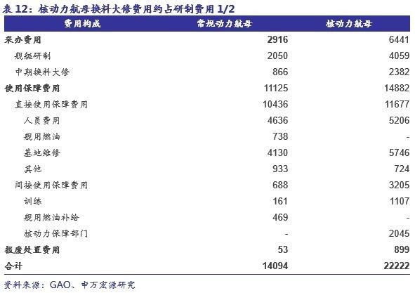 核动力航母中期换料大修费用约占研制费用1/2,主要为核动力装置费用更换及现代化升级费用。与常规动力航母不同,核动力航母的动力装置寿命约30年,到期须进行换料大修。根据美国GAO发布的报告,与常规动力航母相比,核动力航母须额外支出换料大修费用、核动力部门日常保障费用、报废处理费用等,三项费用之和超过了舰艇研制费用。