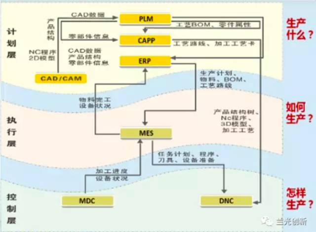 产品在PLM中使用CAD进行三维设计,在ERP做出主生产计划,计划被MES接收后,经APS(高级排产系统)自动生成最优的作业计划,可以具体到每一工序、每一设备、每一分钟,机床需要的加工程序直接通过DNC系统传输到机床里,通过MDC系统实时采集机床状态、加工进度,基于这些数据基础上形成智能化的决策分析与可视化展现,并通过MES系统反馈到ERP系统,实现企业闭环的管理。