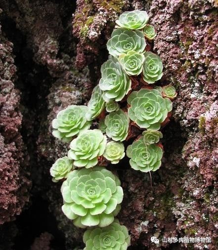 主要分布于大加那利岛(Gran Canaria)、特内里费岛(Tenerife)、耶罗岛(El Hierro)、戈梅拉岛(La Gomera)和拉帕尔马岛(La Palma)的海拔1000- 1900m北向山坡针叶林区域的岩缝中。叶子展开直径为20-25cm,叶子颜色淡蓝色,表面有一层白粉。花期为5-7月,花色奶黄色,花后有大量的种子,同样也可以长出很多侧芽。