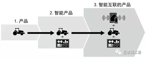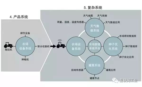 当产品与另外多个产品以及外部数据库连接,产业生态系统出现了。一套各种类型的农业设备与另一套农业设备连接,同时连接到基于地理位置的数据库,一个农业生态系统开始出现了。美国农机设备制造商迪尔公司(John Deere)和爱科公司(AGCO),现在都开始把农业设备连接,产业从拖拉机制造扩张到农业设备优化。自动耕作机根据准确的深度和间隔距离把氮肥注入土壤,然后播种机紧随其后,把玉米种子之间埋入刚施肥的土壤中。然后还有灌溉系统和施肥系统的精准接入,与此同时参考天文气象、农产品价格和农产品期货等信息系统,目的是优化总体农业收益。