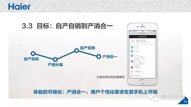 张瑞敏说,最后一个就是目标,就是从自产自销到产销合一。在生产力不发达的时候,小作坊就是自产自销,前店后厂;到大工业生产的时候就是产销分离,我一天制造了几千几万几十万的产品,必须有销售队伍;但是互联工厂就可以做到自产自销,像刚才说的,你传给我,我直接给你,当然最后我们希望达到 产销合一,这个就是里夫金写的《零编辑成本》所说的,将来的社会可能是共享社会,我的产品不要产权,我要的是使用权,我只要使用就行了,产销合一一定是一个方向,既是生产者,又是消费者,3D打印就是典型的产销合一,所以我们现在这里显示的就是有一款空调,由消费者自己在上边众创,创造过程当中很多人加入,最后他们也是消费者。