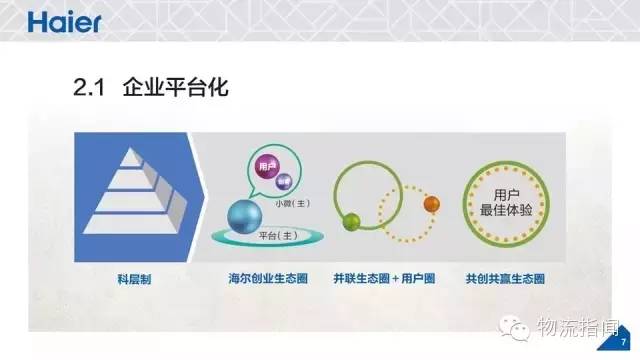 张瑞敏在演讲中谈到,所谓企业的平台化,就是颠覆传统的企业科层制,把传统的层级关系变成海尔的生态圈,整个企业变成一个网络,每一个个体生态圈成为网络上的一个个节点。