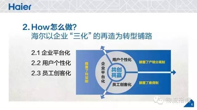 所谓平台主,就是负责建立平台,通过这个平台,能产生多少创业的团队,多少团队能成功,这些员工是创业者,而不是雇佣者。原来的企业内部变成一个并联的生态圈,外部则和用户圈相连。反过来看,传统企业原来都是串联的,从研发做计划,一直到制造,一直到销售就是这么一条流水线下来的,现在为了 满足用户需求,所有的资源都在一起,共同来创造用户。