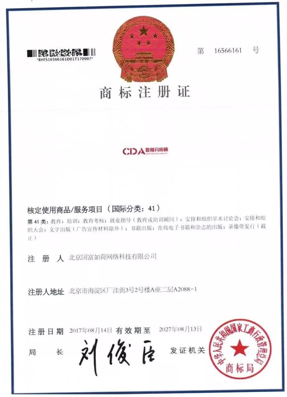 首先,CDA数据分析师注册商标历经两年多终于成功获批;