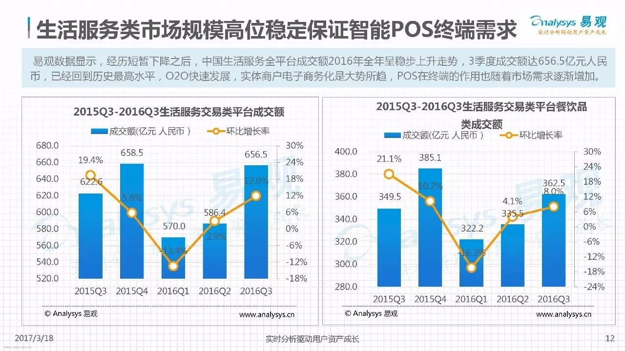 据易观数据显示:中国生活服务全平台成交额2016年全年呈稳步上升走势,3季度成交额达656.5亿元人民币,已经回到历史最高水平,O2O快速发展,实体商户电子商务化是大势所趋,POS在终端的作用也随着市场需求逐渐增加。