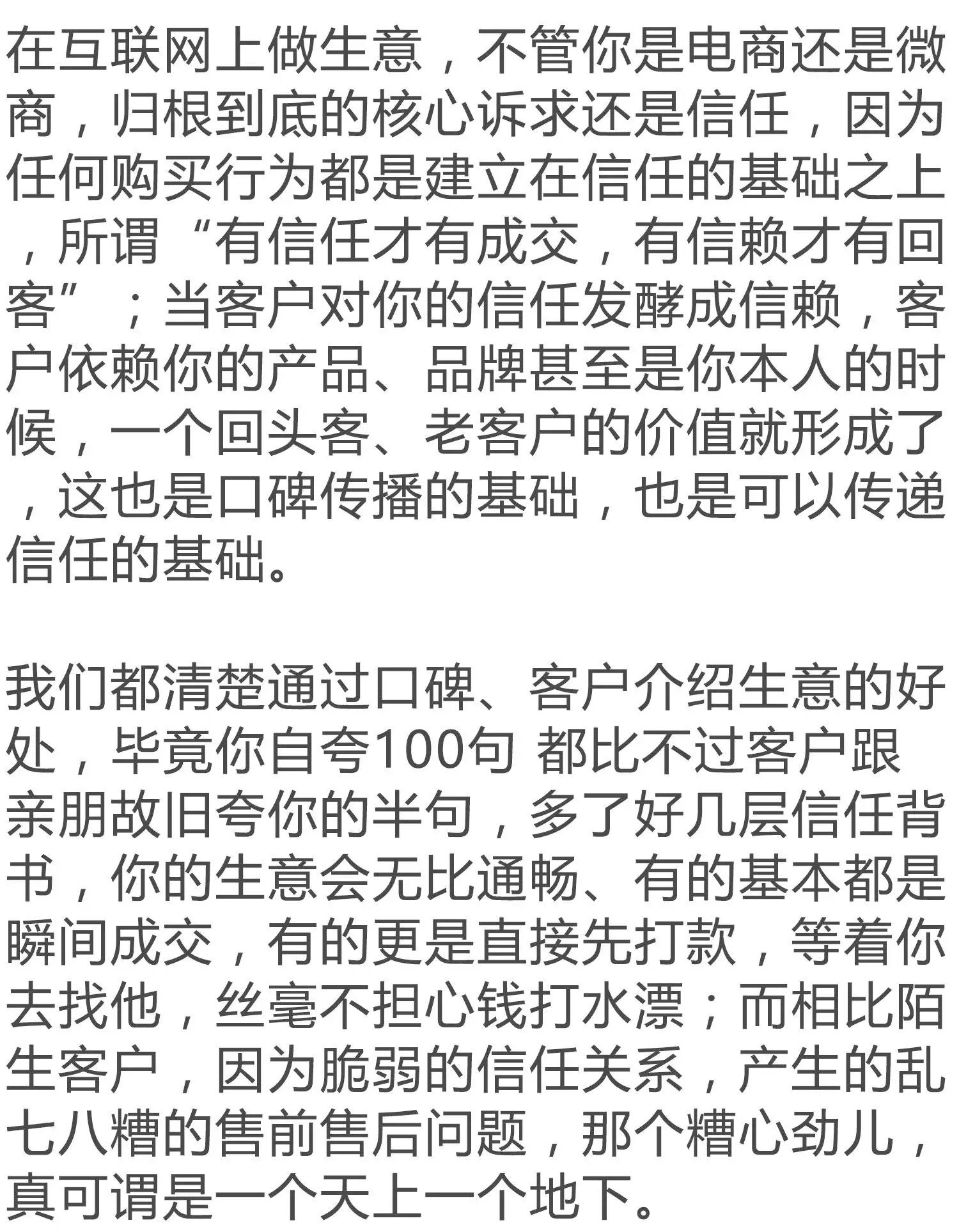 老舟扯这块儿看似跑题,实则是想苦口婆说的阐述一个道理,任何人或公司的时间、精力、人力都是有限的,尤其是中小品牌;咱们做了东、就漏了西,深了南,就浅了北;如果这两者没搞明白,你针对客户做的信任,完全就是浅尝即止、徒耗钱粮的无用功。
