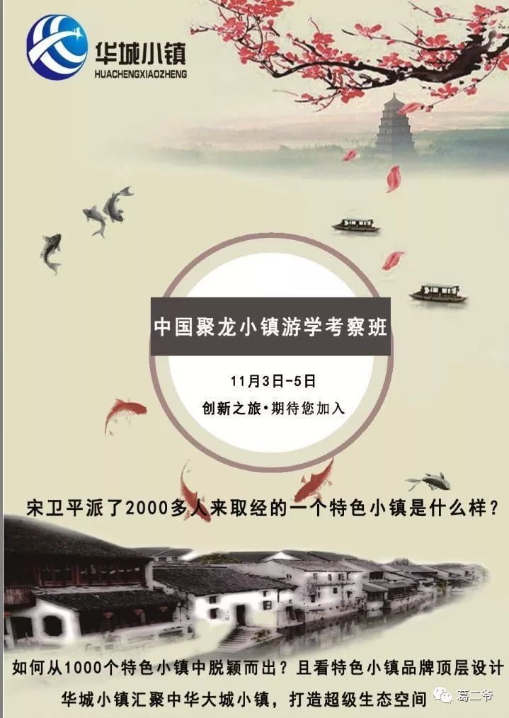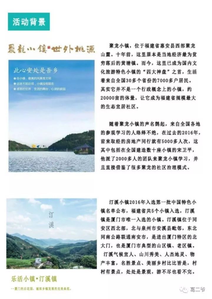 2017年11月3日—5日由华城汇小镇公司主办特色小镇《聚拢小镇及汀溪康养小镇项目考察游学 福建站》当今一线操盘手亲自解读四大神盘之首聚拢小镇和汀溪康养小镇的规划申报、IP打造、产业规划、产业运营、项目投融资等,与参会嘉宾共同践行田园东方以及拈花湾小镇项目的创新商业模式和运营模式。,30人小团,名额有限,要求:地产开发商,规划设计,政府人员