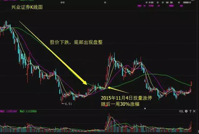 第一,股价一定要超跌,2--3个月时间,股价从高点跌幅超5%以上,下跌后经过至少3个月的盘整,第二,突然出现7% 大阳线,最好是涨停板,第三,四点同上。案例兴业证券,2015年6月到8月经过下跌在底部盘整,11月4日放量涨停,随后一周30%的涨幅